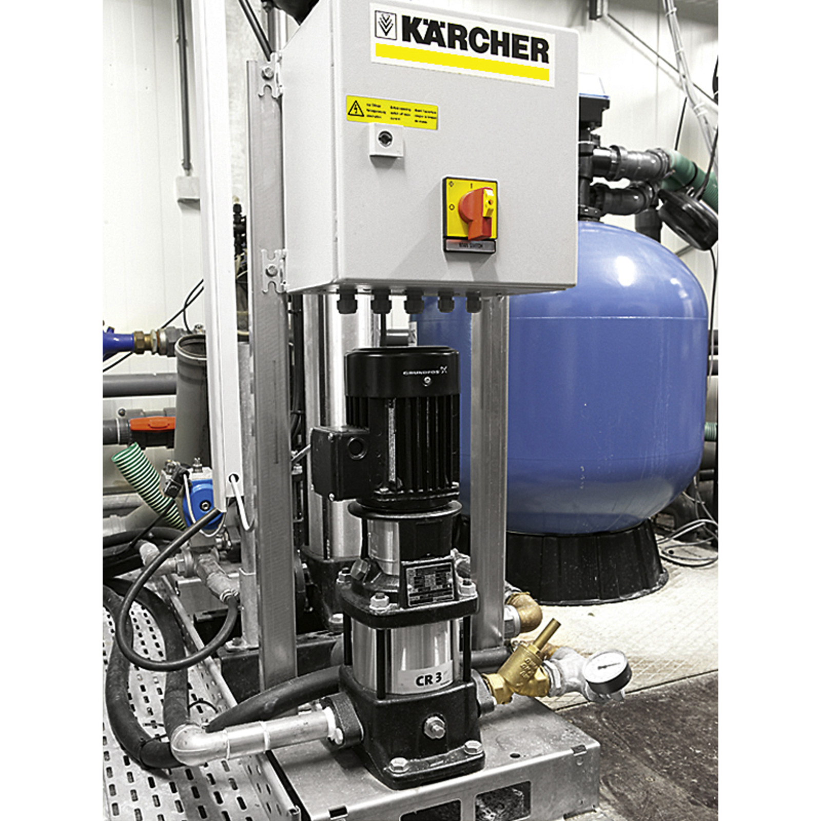 Čerpadlo, které zajišťuje potřebný hydraulický tlak 3-6 bar a množství vody 50 l/min. ze zásobní nádrže pro zařízení.