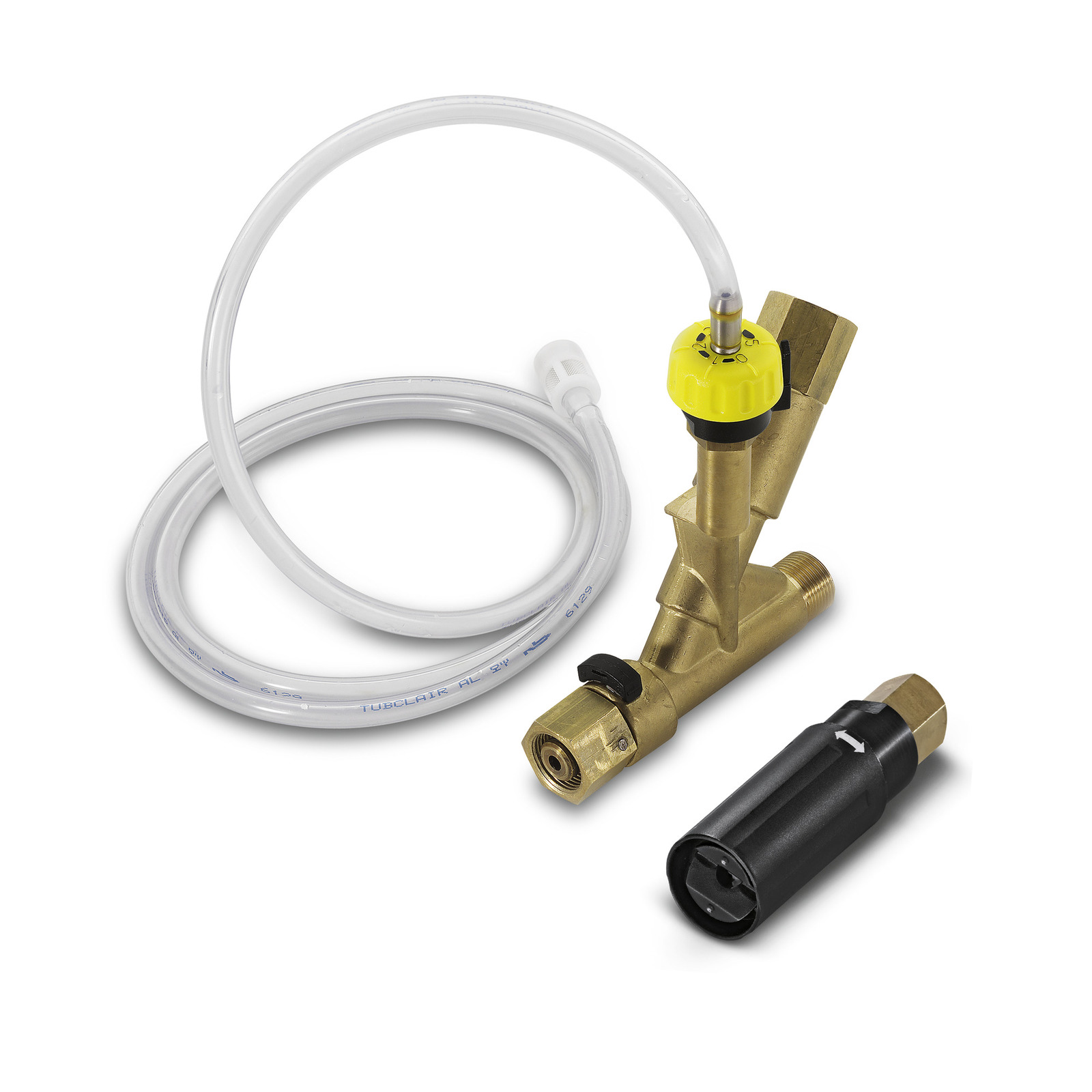 Vysokotlaký pěnovací set, kompletní k provozu, pro mobilní a stacionární HD/HDS stroje pro čištění a dezinfekci. Pěnovací tryska pro připojení na vysokotlaký nástavec + vysokotlaký injektor čisticích prostředků s přesným dávkovacím ventilem 0-5%. Sady trysek pro různé řady přístrojů (viz Sady trysek) je nutné objednat samostatně.