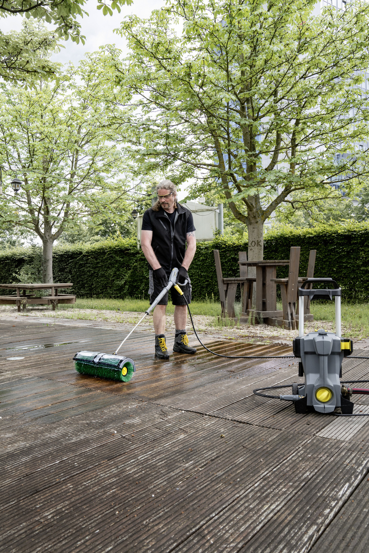 Nástavec z tvrdého kartáče pro použití s hydraulickým pohonem (4.762-584.0). Na drsné fasády, kamenné a dřevěné terasy. Bezpečný a snadný systém rychlé výměny.