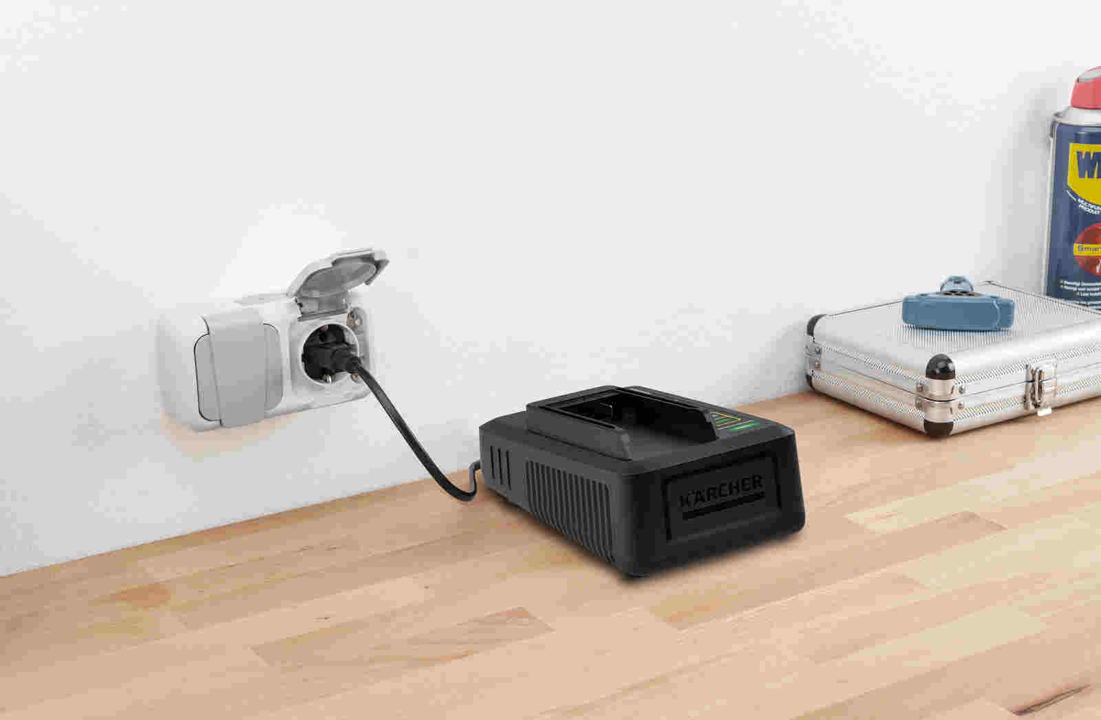 Rychlonabíječka 18 V, nabije Kärcher baterii 18 V / 2,5 Ah na 80 % kapacity už za pouhých 44 minut. Lze ji použít na všechny baterie Kärcher s 18 V platformou.