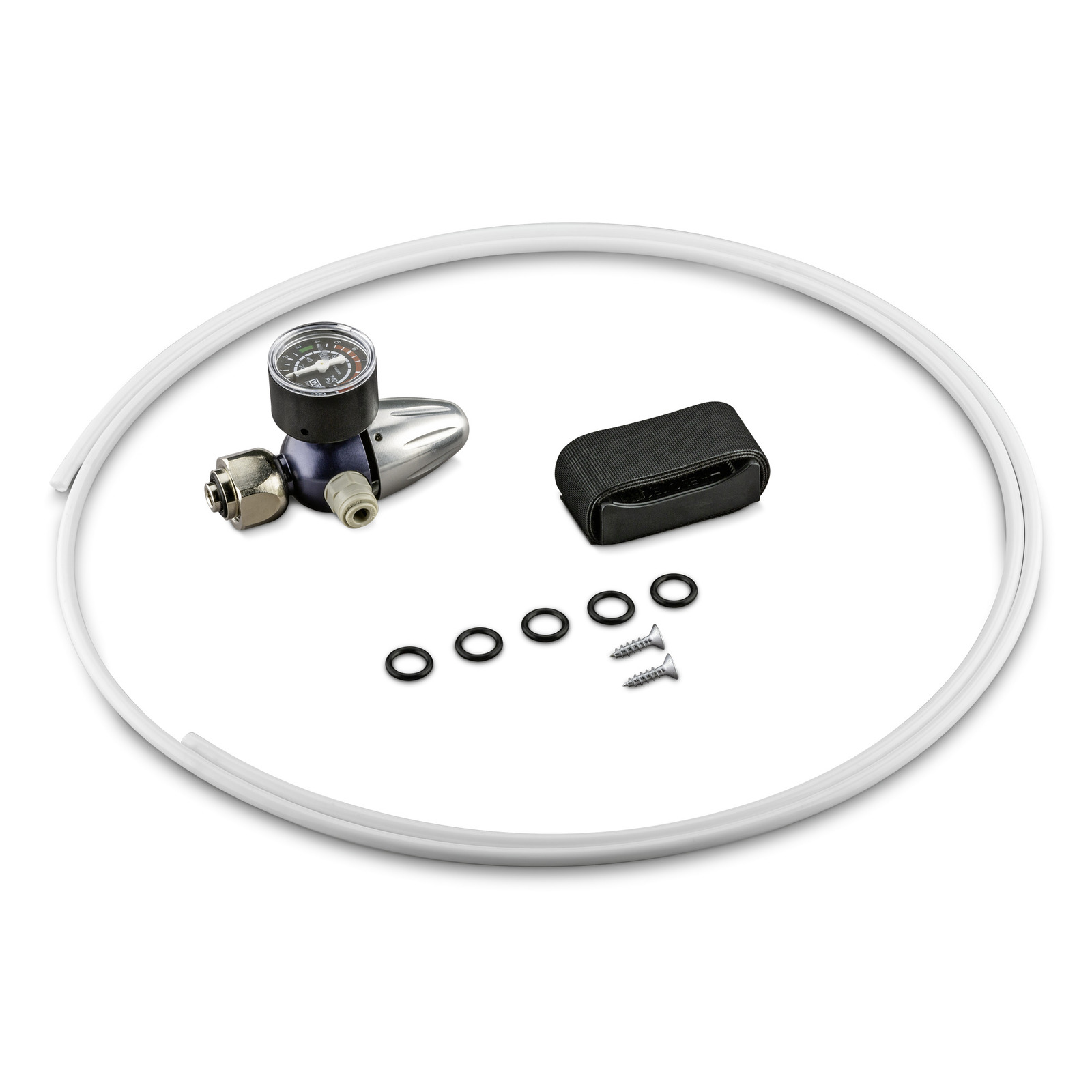 Reduktor tlaku CO2 pro připojení 2 kg láhve CO2 k výdejníku vody WPD 55 S od Kärcher. Obsahuje nástěnný držák a připojovací hadici.