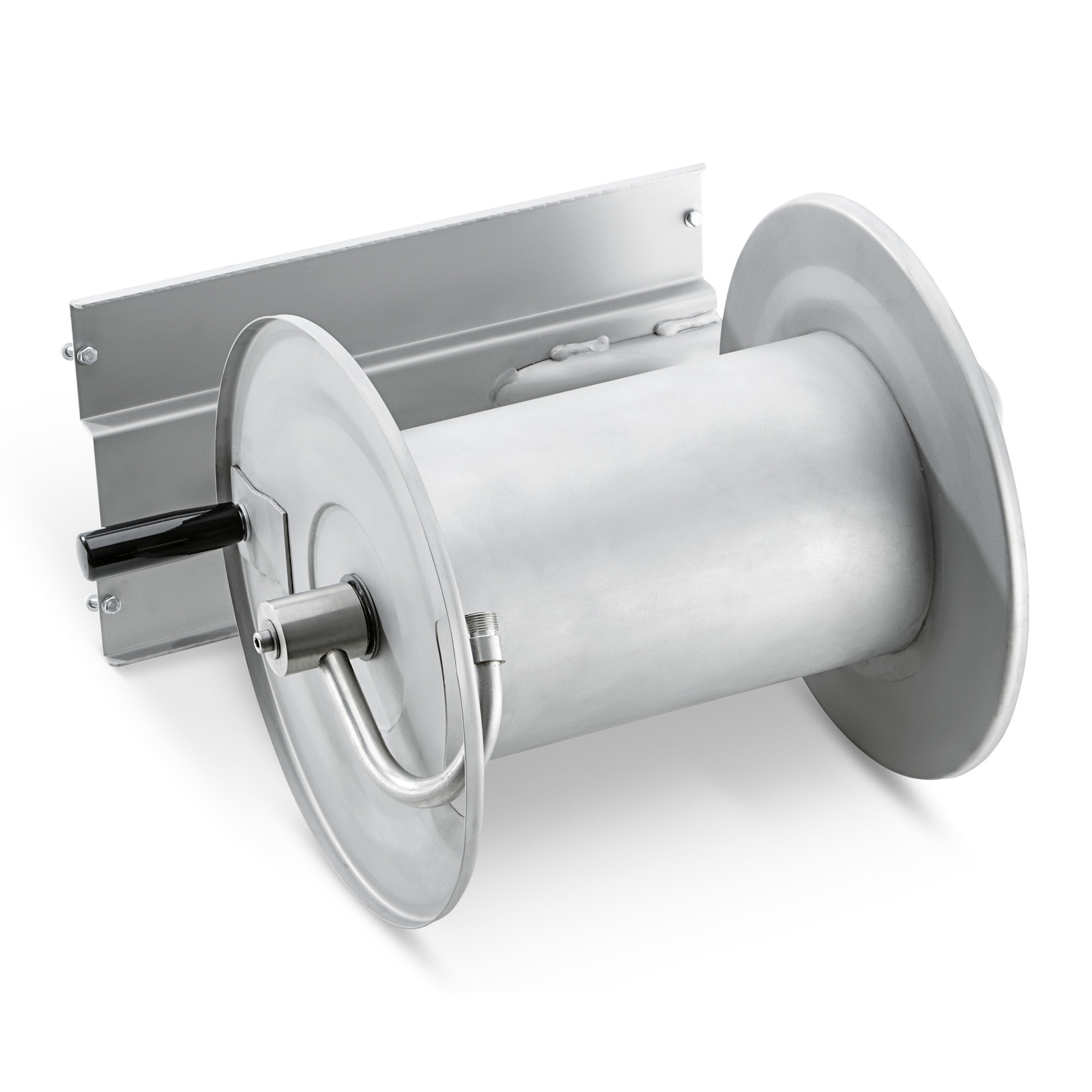 Automatický buben na navíjení hadice pro montáž na stroj. Pro bezpečné uložení vysokotlakých hadic s úsporou místa (se spojovací hadicí na VT výstup ze stroje).