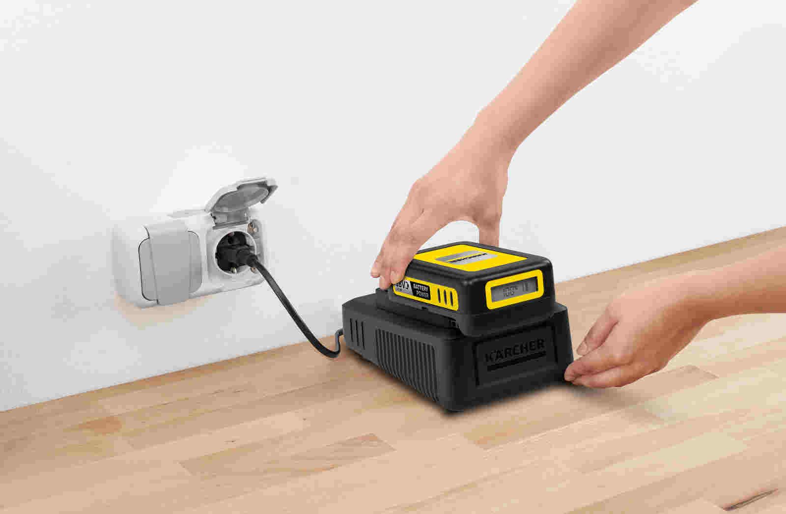 Rychlonabíječka 18 V, slouží k nabíjení Kärcher baterii 2,5 Ah (na 80 % kapacity už za pouhých 44 minut) a 5,0 Ah. Baterie je vybavená Inovativní Real Time Technology - LCD displej zobrazuje neustále zbývající dobu chodu, zbývající dobu nabíjení a stav nabití. Starter Kit Lze použít na všechny stroje Kärcher s 18 V platformou.