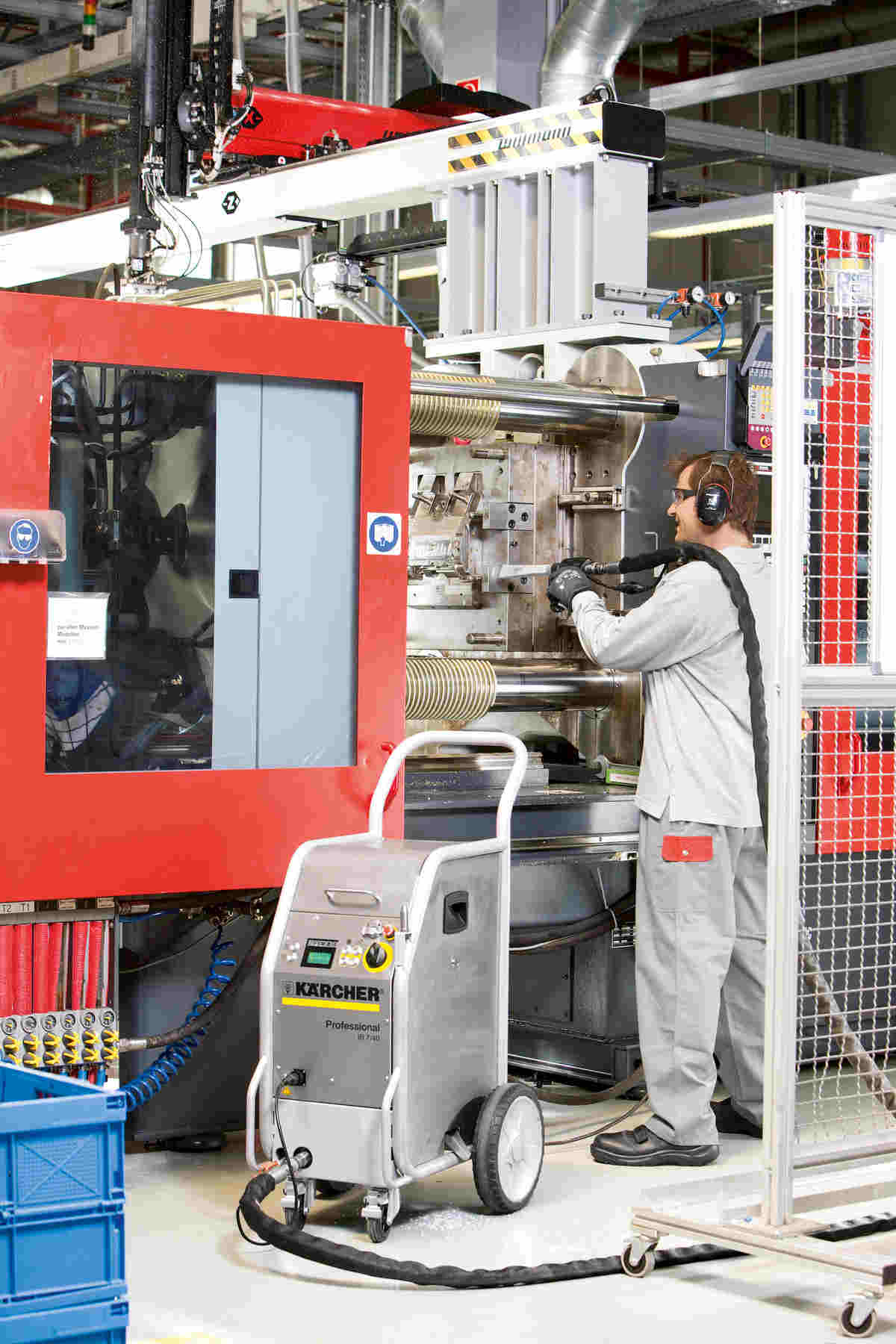 Čištěním tryskací technikou suchého ledu Kärcher lze realizovat šetrné a řádné čištění nástrojů, forem, povrchů a strojů s velmi krátkou přípravnou dobou a dobou výpadku. Při tomto postupu jsou malá zrníčka - tak zvaná tříšť - ze zmrazeného, -79°C studeného kysličníku uhličitého dávkována do proudu tlakového vzduchu a tímto zrychlována. Při dopadu na čištěný povrch se tento silně ochladí. Na základě různě silného smršťování vrstvy nečistot a podkladu způsobeného teplotními výkyvy dojde k narušení zkřehlého filmu nečistot, proniknutí a dokonalé sublimaci tříště. Toto odstřelí znečištění od podkladu. Účinek tohoto postupu se zakládá na kinetické energii tříště, zkřehnutí a uvolnění znečištění ale i explozivní sublimaci tryskaného materiálu. Nepatrná tvrdost tříště suchého ledu zajišťuje, že dochází k minimální abrazi povrchů. Podobně jako jiné postupy tryskání je tryskání suchým ledem vhodné pro opracování komplexních povrchů, jako jsou například u tlakových a jiných strojů. Na rozdíl od paprsku písku, vody nebo páry nezůstane v nebo na čištěném předmětu ani voda ani tryskaný prostředek, čistící médium se doslova vypaří do vzduchu. Toliko otryskané nečistoty musí být ještě odfouknuty nebo - například vysáty vysavačem. Doby sušení odpadají, očištěné zařízení může být okamžitě uvedeno do provozu. Jelikož kysličník uhličitý - zmrzlý nebo v plynném skupenství - je navíc velmi špatný vodič, mohou být bez problémů otryskány i elektrické instalace. Protože při čištění suchým ledem nejsou nanášeny ani voda ani jiné cizí látky, nevznikají problémy s korozí, odpadá často náročné odstraňování tryskaného prostředku právě tak jako drahá likvidace odpadní vody kontaminované čistícím prostředkem a rozpuštěnými nečistotami. Jelikož se do čištěného předmětu nedostanou cizí látky, je možné v mnohých případech upustit od demontáže výrobních strojů - to šetří čas a zabraňuje poškození nástrojů a citlivých dílů při manipulaci. Horké formy lze otryskat bez předchozího schlazení, což v mnoha případech vede z důvodu malého přilnutí nečistot k ještě lepším výsledkům čištění. Přitom je krátké ochlazení otryskávaných povrchů na základě zkušeností absolutně neškodné. IB 7/40 byl zkonstruován speciálně pro mobilní používání za nejtvrdších podmínek. Stroj těžký cca 69 kg je díky svému principu zavazadlového vozíku a očišťování vzduchu maximálně mobilní, čistící proud tlakového vzduchu ale i dávkovací jednotka tříště jsou řízeny elektricky vypínačem v rukojeti pistole. Plus bod elektrického řízení: Na rozdíl od čistě pneumaticky řízených strojů nevznikají problémy se zamrzáním, stroj pracuje spolehlivě a je bez problémů schopen trvalého provozu. Snímatelná krabička trysek zajišťuje, že je příslušenství vždy uklizené a vždy pohodlně na dosah. Pro ergonomicky tvarovanou pistoli existuje na stroji zvláštní držák - toto usnadňuje také mimo jiné výměnu trysek. Obslužné prvky včetně nouzového vypínače jsou umístěny v přední části krytu stroje, takže lze IB 7/40 bezpečně obsluhovat i v rukavicích. Vlastní robustní kryt je kompletně vyroben z ušlechtilé oceli, jeho bočnice lze otevřít bez použití nářadí pouze rychlouzávěrem. Dvě počítadla provozních hodin - jedno nelze vynulovat, druhé lze - poskytují informaci o době celkového provozu a aktuální době nasazení. Tlakový vzduch nutný pro provoz IB 7/40 je možné odebírat z kompresoru nebo přímo z rozvodné sítě. Lze pracovat mezi 0,5 a 3,5 kubík metry vzduchu za minutu při tlacích mezi 2 a 10 bar (0,2 až 1,0 MPa). Nádrž tříště stroje IB 7/40 má kapacitu 18 kilogramů, tím je možný dle nastavení spotřeby provoz čištění přibližně 20 až 60 minut. Přípojka elektrického proudu pro IB 7/40 je 220-240V, 50Hz, 0,6kW, stroj může být provozován na obvyklé síťové zásuvky.