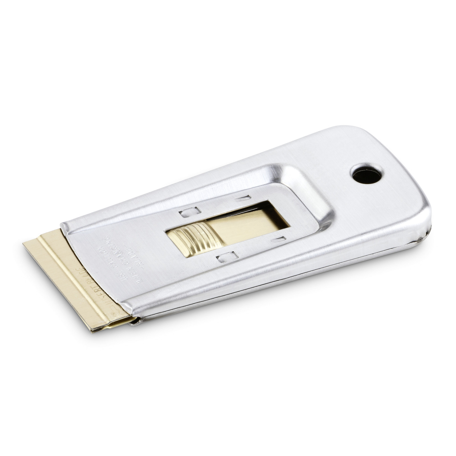 Škrabka na sklo z kovu od firmy Kärcher. K čištění všech skleněných povrchů. Škrabka se dodává bez čepele, náhradní čepele jsou k dispozici.