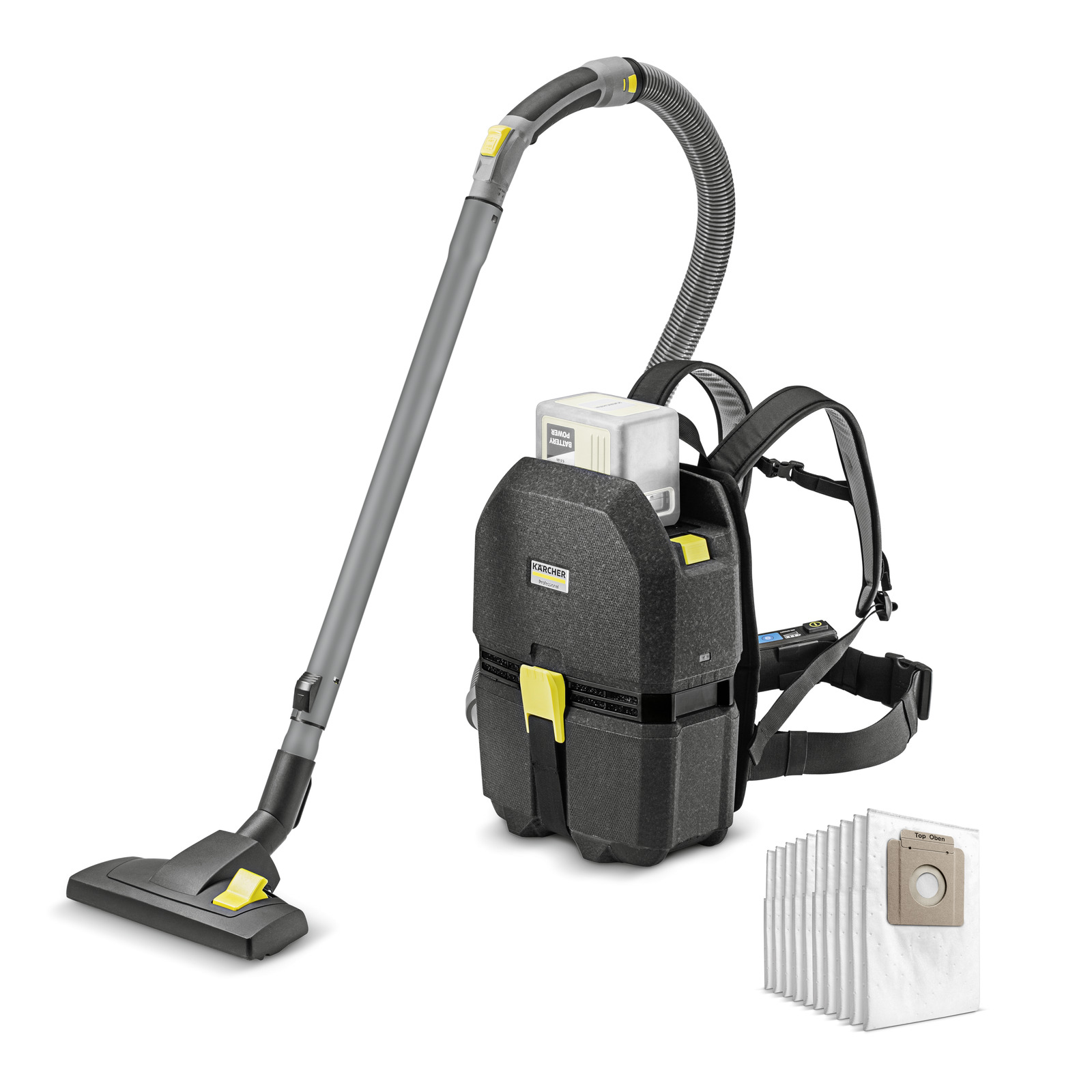 KÄRCHER BVL 3/1 Bp Anniversary Edition je výkonný a lehký vysavač vybavený batohovými popruhy pro zavěšení na záda. Hmotnost pouhých 4,5 kg zajišťuje pohodlné nošení i při delších pracovních intervalech. Vysavač BVL 3/1 Bp je určen pro náročnou práci při úklid například: kinosálů, autobusů, práci ve výškách apod.. BVL 3/1 Bp s objemem odpadní nádoby 3 l je perfektním řešením pro úklid ve stísněných prostorách, výkonná baterie Kärcher Battery Power zajišťuje dlouhé doby chodu na jedno nabití a ergonomický nosný rám vysavače zbavuje práci námahy. S praktickým ovládacím panelem, který je umístěn na na bederním popruhu a slouží pro ovládání všech důležitých provozních a doplňkových funkcí vysavače. Bez uhlíkový elektromotor zajišťuje dlouhou životnost a výrazně šetří servisní náklady. je také extrémně odolný proti opotřebení.