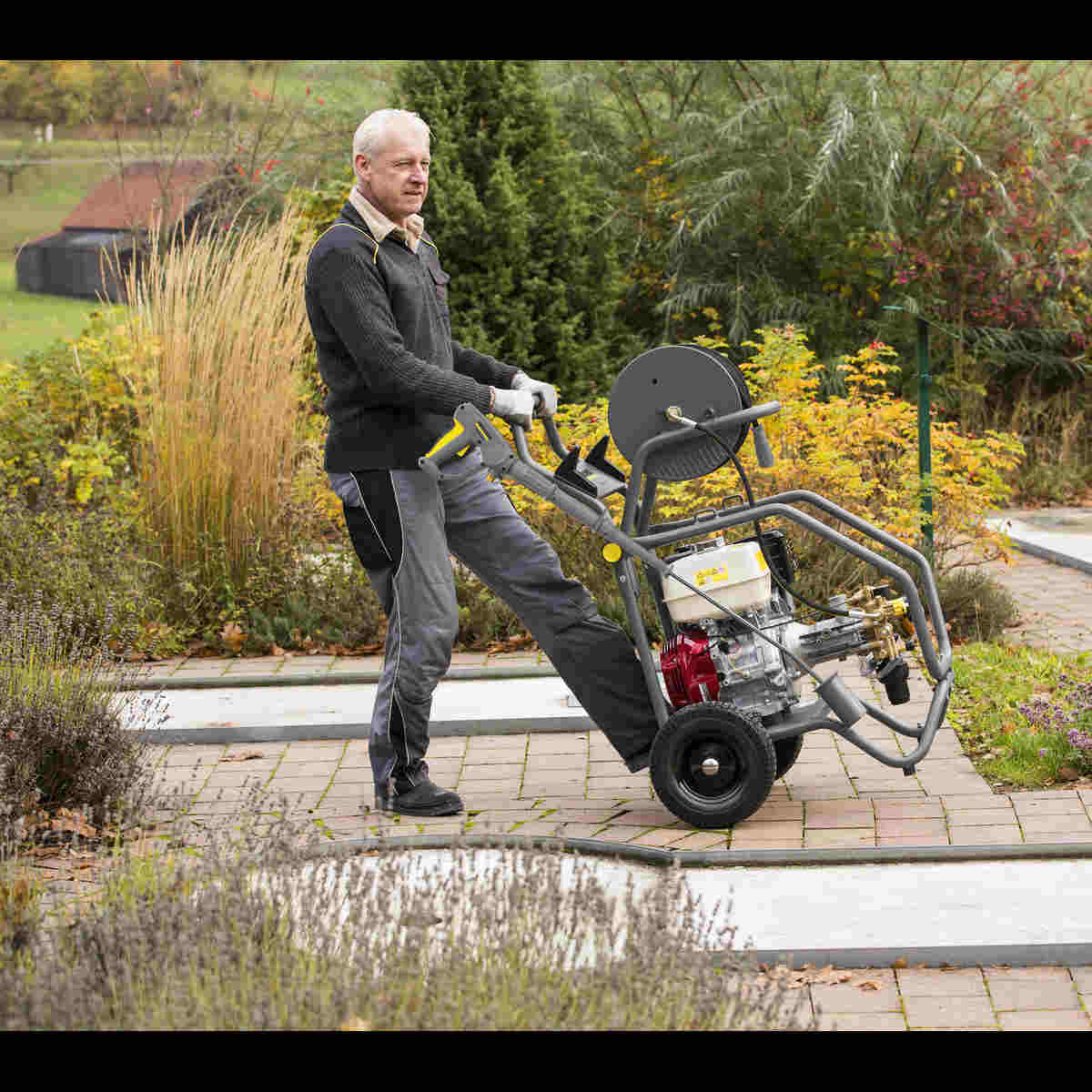 Výkonný, všestranně použitelný vysokotlaký čistič bez ohřevu vody Kärcher HD 7/15 G, nezávislý na zdroji elektrického proudu. Vzduchem chlazený čtyřtaktní benzínový motor Honda GX 160 s reverzním startérem. Motor a čerpadlo jsou namontované ve stabilním rámu z trubek, který se dá dobře zatěžovat, spolehlivě chrání uvedené komponenty před vibracemi a tím i před poškozením. Rám z trubek je nastříkaný práškovou barvou proti korozi. Pro uložení příslušenství jsou u tohoto stroje přizpůsobené odkládací plochy. Velká kola s pneumatikami umožňují pohodlnou manipulaci i v těžko schůdném terénu. Tří pístové axiální čerpadlo s přímým pohonem zajišťuje účinnost a dlouhou životnost přístroje. Hlava čerpadla z mosazi, ventily z nerezové oceli, písty s keramickými vložkami jsou další výhodou, která umožňuje dlouhodobé používání.