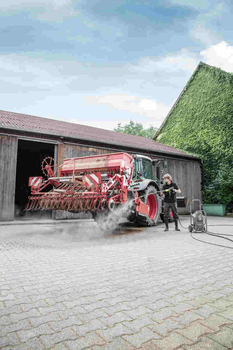Odolný vysokotlaký čistič HD 8/18-4M Cage Farmer zvládne i tvrdé zacházení. Díky pracovnímu tlaku až 18 MPa hravě odstraní i hrubé nečistoty z vozidel i pracovních nástrojů.