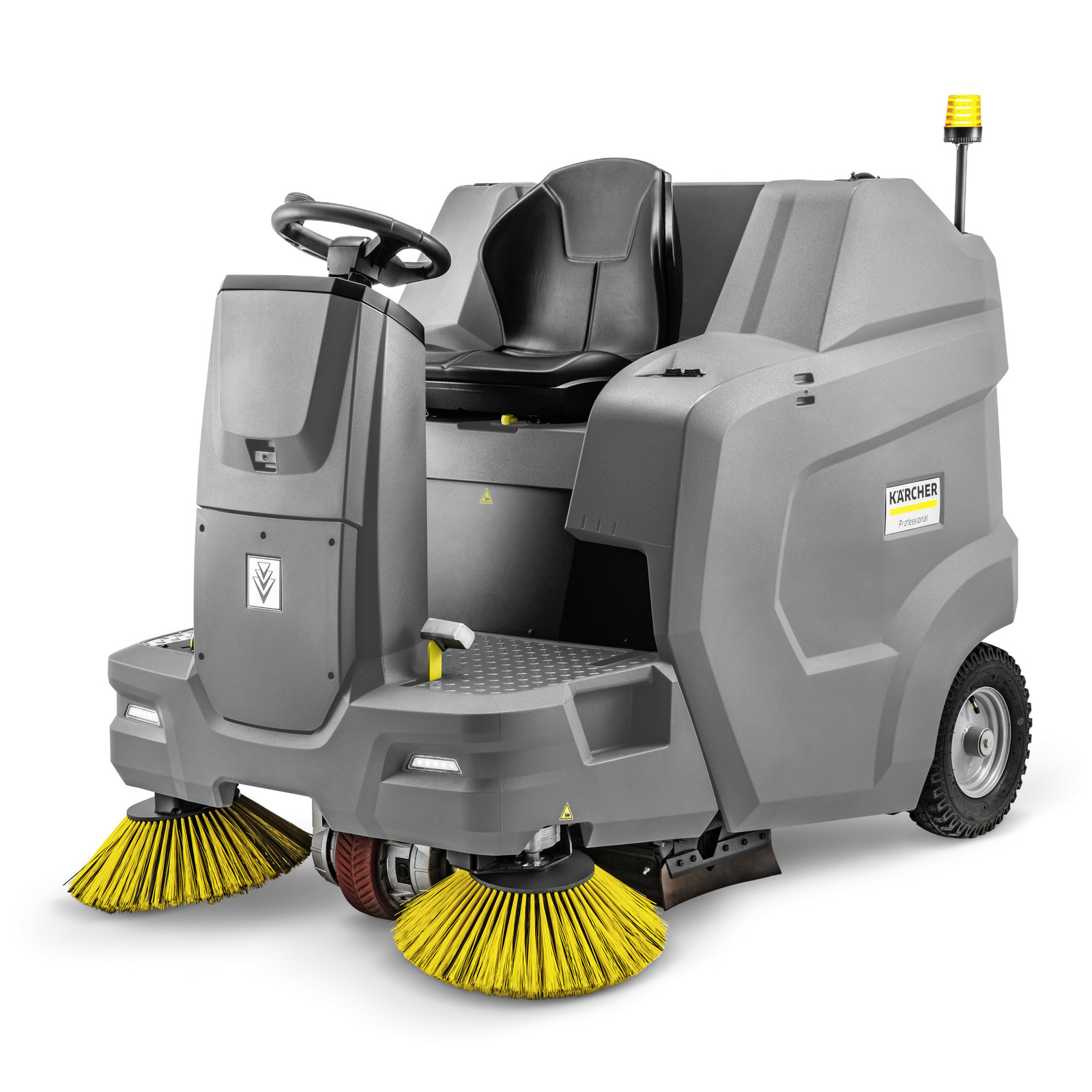 Nulové emise, ideální do interiérů: zametací stroj KM 100/120 R Bp Pack s 240Ah baterií, vestavěnou nabíječkou, hydraulickým vyprazdňováním a dvěma bočními kartáči ve standardní výbavě.