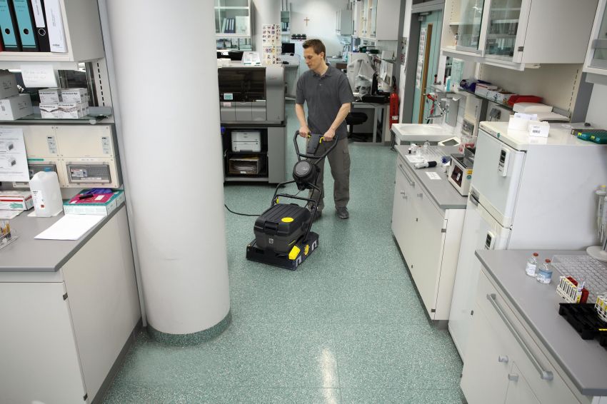Podlahový mycí stroj s odsáváním Kärcher BR 40/10 C Adv napájený ze sítě 230 V. Stroj je vybaven dvěma válcovými kartáči 400 mm, které jsou poháněny jedním, energeticky úsporným motorem. Na každé straně je stroj zakončen sací lištou s gumovými stěrkami ( možno i olejuvzdorné ). Díky těmto dvěma lištám lze strojem pracovat v každém směru. Stroj má dvě, na sobě uložené nádoby a to na čistou vodu o objemu 10 l a na znečištěnou o objemu 10 l. Nádoby jsou velmi jednoduše snímatelné a vybavené transportním držákem pro snadné nošení. Voda je mezi kartáče vháněna pomocí čerpadla, které se ovládá na rukojeti stroje, stejně jako celkové spouštění stroje. Sací lišta stroje jsou napojeny na odsávací systém, jehož médiem je sací turbína, umístěná ve stroji.