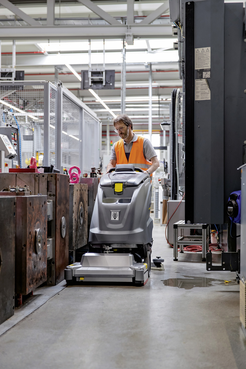 Ručně vedený podlahový mycí stroj s odsáváním (60 l) pro plochy 1.000 až 2.500 m2 přesvědčí pohonem pojezdu, systémem KIK, vyplachováním nádrže, funkcí Auto-Fill, s válcovou kartáčovou hlavou a stěrkou ve tvaru V.