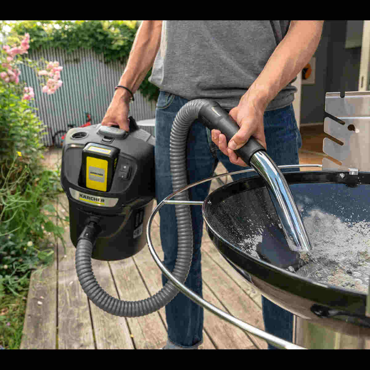 Vysavač na popel a hrubé nečistoty Kärcher AD 2 Battery je stroj vhodný zejména pro úklid popelu z krbů, grilů a topenišť. Sací motor o výkonu 230 W se vyznačuje trvalou sací silou. Robustní konstrukce a inovativní speciální filtrační technologie s kovovým filtrem na hrubé nečistoty a plochým skládaným filtrem s integrovaným manuálním oklepem umožňuje bezpečné odstranění popela .