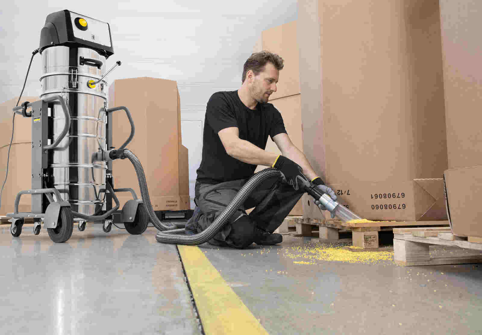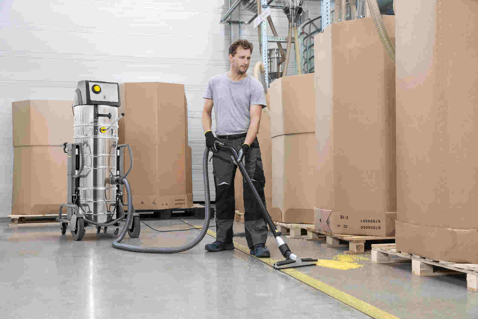 Průmyslový vysavač KÄRCHER IVM 60/30 s pohonem 400 V, vhodný pro náročné použití v průmyslu, stavebnictví, nebo strojírenství. Velkou výhodou je dmychadlo s třífázovým elektromotorem s postranním kanálem s životností přes 20 000 hodin a velký hvězdicový filtr v prachové třídě M s pohodlným a praktickým ručním čištěním. Robustní stroj vyrobený v pevném trubkovém rámu s odolným ocelovým pouzdrem a odpadní nádrží z nerezové oceli. Snadnou manipulaci umožňují 2 velká a 2 rejdovací kola. Vysavač lze téměř univerzálně použít v průmyslovém prostředí pro vysávání jemných i hrubých pevných materiálů – v případě potřeby i ve třísměnném provozu.
