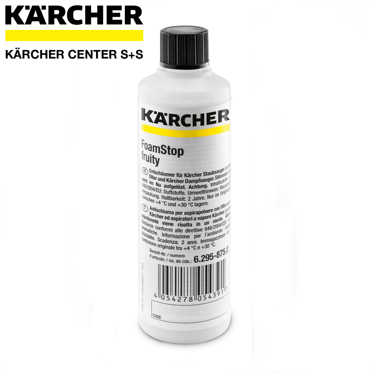 Foam Stop - odpěňovací tekutina s bezalergení vůní citronu, šetrná k životnímu prostředí pro vysavače a parní vysavače s vodním filtrem/extraktory (čističe koberců). Zabraňuje tvoření pěny a prodlužuje životnost strojů . Pouze 2 ml ( jeden uzávěr ) na jednu plnou nádrž stroje.Souhrn - Kärcher, Odpěňovač - RM FoamStop Fruity 125ml