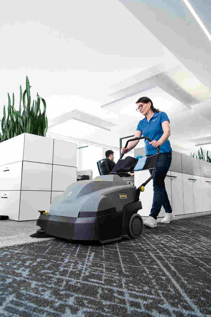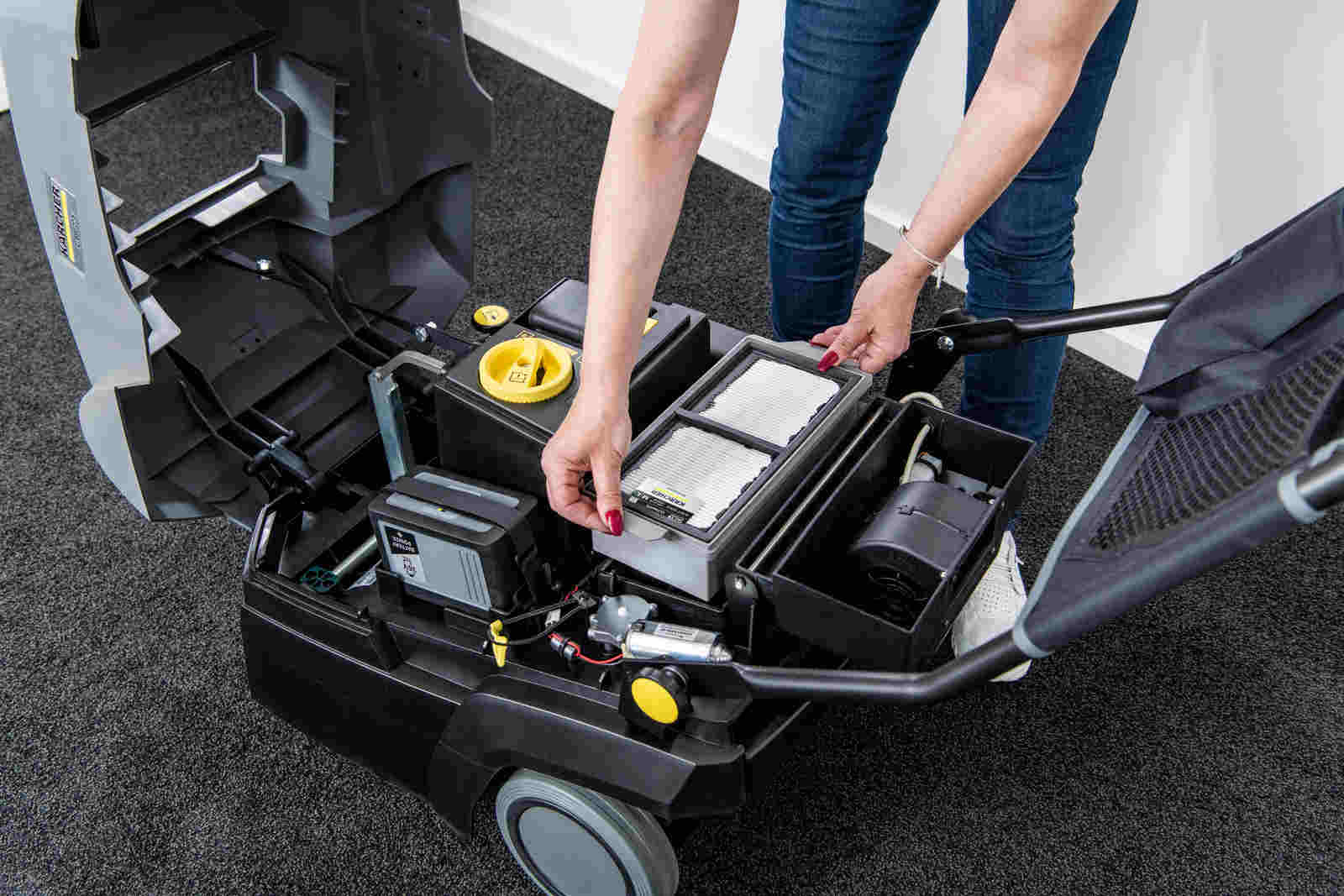 Bateriový zametací stroj KÄRCHER CVS 65/1 Bp  slouží pro velkokapacitní úklid koberců v interiérech například hotelů, penziónů a kongresových hal. Výkonná 36voltová lithium-iontová baterie umožňuje až 60 minut nepřetržitého provozu a úklid zhruba 1 800 metrů2 kobercové plochy na jedno nabití. Účinný, 2stupňový filtrační systém skládající se z předfiltru a plochého skládaného filtru prachových tříd L a M potaženého PTFE zajišťuje bezprašnou práci, přičemž velmi nízká pracovní hlučnost pouhých 56 dB(A) umožňuje použití také v oblastech citlivých na hluk. Hlavní zametací válec zametače lze přesně nastavit na příslušný typ koberce. Tím se snižuje opotřebení válců, účinně zabraňuje poškození koberce a umožňuje čištění prakticky jakéhokoli koberce - od vpichovaných koberců a krátkých vlasů až po koberce se smyčkovým vlasem. V bale BP Pack jsou baterie a nabíječka součástí dodávky.